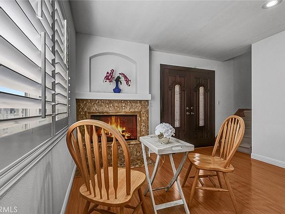 Step through the grand double-door entry into a bright and inviting living space, complete with hardwood flooringt hroughout the first level. The living room features a cozy fireplace and faces to a charming backyard area, perfect for relaxation. The gourmet kitchen is a chef’s delight, featuring granite countertops, stainless steel appliances, and ample cabinetry, seamlessly connecting to the dining area. A tiled full bathroom with a shower and storage completes the first floor.