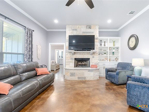Immaculate 2022 Build in a Pristine Neighborhood! This stunning 3-bedroom, 2-bath home offers exceptional craftsmanship and modern comfort throughout. Featuring stained concrete floors, crown molding, and a cozy wood-burning fireplace with a built-in bookcase, every detail has been thoughtfully designed. The open kitchen/dining combo overlooks the backyard and includes an island with sink, stainless steel appliances, and plenty of workspace—perfect for everyday living and entertaining. The large primary suite provides a peaceful retreat with a walk-in shower featuring beautiful tile work and a double vanity. Guests will appreciate the deep soaking tub in the secondary bath. Step outside to a spacious back porch, ideal for entertaining or relaxing. Situated on the largest lot in the neighborhood, the property boasts plush, carpet-like grass, a full sprinkler system, chain-link fencing, and a well-equipped outbuilding with electricity—a perfect workshop or storage space. Move-in ready and meticulously maintained, this home truly stands out. Don’t miss your chance to make it yours!