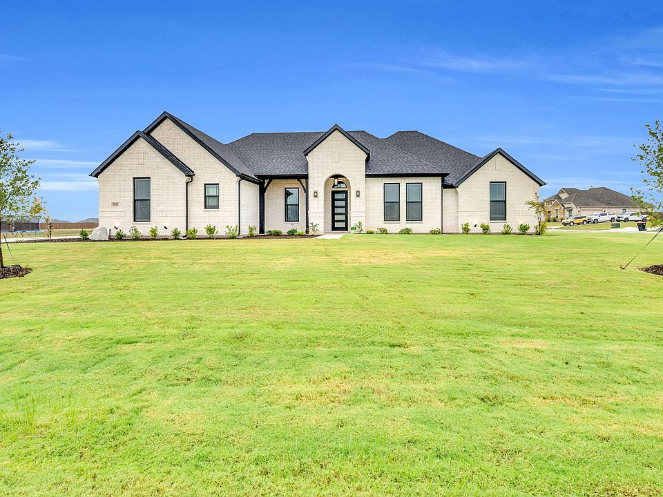 Welcome to Springside Estates in Waxahachie ISD! This stunning modern white brick home with cedar accents offers 4 bedrooms, 2 baths, and a versatile flex room that can serve as a study or game room, all within 2,487 sq. ft. per builder plans. Sitting on a premium corner lot, the property features an extended front patio and a spacious 3-car garage. Inside, the foyer welcomes you with 11-foot ceilings, leading to a large family room with engineered wood floors, a linear electric fireplace with a cedar mantle, and plenty of natural light. The gourmet kitchen is a chef’s dream, showcasing a curved wrapped island with quartz countertops, black pendant lighting, white custom cabinets, pots and pans drawers, and LG appliances, while the breakfast area offers a cozy dining space. The separate utility room is designed with upper cabinets and modern crystal black floor tile. The main bedroom boasts 10-foot ceilings, upgraded carpet, and a luxurious bath with a garden tub, dual quartz vanities, framed black mirrors, comfort-height toilets, and his-and-hers walk-in closets with built-in shoeboxes and upper racks. Secondary bedrooms also include walk-in closets, while the full bath offers a double vanity, matte black fixtures, and an upgraded tiled shower. Outdoors, the extended covered patio with a built-in brick wood-burning fireplace and electric hookup for a future TV is perfect for entertaining. Additional highlights include spray foam insulation, a smart home package with video doorbell and security, and 2inch faux wood blinds throughout.Ask about our Hometown Hero Incentive Program!