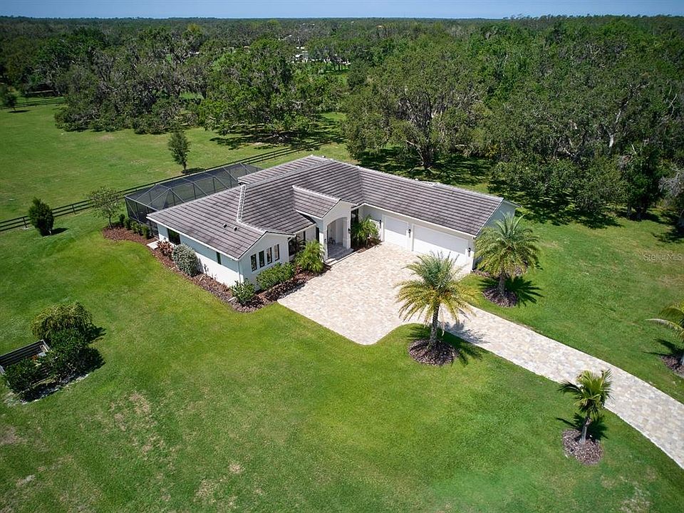 A PRIVATE, GATED ESTATE ON 5-ACRES! The Industrial Farmhouse is a modern elegance that best captures the ambiance of this 3- or 4-bedroom, 3 bath, pool home. Its design elements merge a timeless country lifestyle with a minimalist vintage trend. Showcasing an open floor plan and a simple neutral palette, paired with glass, stone, metal, and wood features. French doors present the foyer that flows easily into the great room. Distinct travertine flooring is skillfully tiled throughout the residence. A tray ceiling with crown molding and a 60-inch linear gas fireplace defines the living area. Nearby the dining space flanks an open kitchen, warm and expansive boasting furniture quality wood cabinetry with lighted glass display. Combined with a glass subway tiled backsplash and lots of granite prep space. A matching center-island is complete with storage and bar seating for four. A stainless-steel hood crowns a gas range with double ovens. Additional black stainless-steel appliances include the refrigerator, a dishwasher, and a microwave. Task and drop lighting, and a large single basin sink add finishing touches. Two individual sets of double doors provide privacy to the den with a closet [or 4th bedroom] and the primary suite. The Owner’s retreat has opposite faced walk-in closets with built-ins (the floor safe stays). The personal bath offers granite, wood cabinetry, double sinks, built-in shelving, and a water closet. A jetted tub and a separate marble shower, with a glass door and dual heads. Two additional bathrooms in the guest wing are well-appointed with granite, marble, and wood cabinets. The split plan layout also has two more bedrooms, and a convenient laundry room alongside walk-in pantry storage. Crown moldings, designer lighting fixtures and finishes, impact rated windows and doors, energy efficiency and state-of-the art security equipment are bonuses. A wall of sliding glass doors overlooks outdoor living on the paver-brick lanai. Screened to incorporate the PebbleTec heated pool with a swim ledge. A side-entry 3-car garage, with Terrazzo floors, has door openers and two additional refrigerators that remain. The high and dry, cross-fenced property encompasses 5-acres with wooded preserves, a vegetative buffer, and a pond with an easement. The perfect environment for wildlife or livestock to thrive. Poised nobly on a cul-de-sac with a remote/keypad gated entrance that protects the long paver brick drive, the custom home, and its inhabitants. As part of Deer Hammock, residents enjoy a deed restricted standard of living that welcomes horses, in Sarasota County. Please note that the furniture is negotiable.