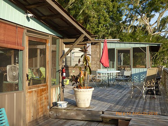 Beautiful move in ready, waterfront property with large wooden deck along the entire back and south side of the property and a private 280 foot pier on Florida's 2nd largest lake, Lake George, on The St Johns River! The main house features water views from every room! Vaulted ceilings, 2 bedrooms, living room, kitchen, bathroom and large waterfront screened and covered porch. The studio apartment has a private entrance with a large open floorplan, including a full kitchen and bathroom, walk in closet, outdoor bathroom and private back patio. At the end of the pier there is a large boat dock with electricity and water service. The home also features a large detached waterfront covered and screened porch with electricity and water. This home home is in a small private section of The Pine Island Fishing Resort, on Lake George among about 3 dozen custom built homes ranging, in value from about $75,000 - over $650,000. This property is surrounded by The Lake George State Forest and offers a very private retreat for outdoor enthusiasts, boaters and fishermen. The Pine Island Fishing Resort area is a well kept secret with a public boat ramp, small bar and one way in and out (by car)... you can also get to The Pine Island Fishing Resort by boat from The St Johns River. This home is in very good condition and continues to be maintained regularly.