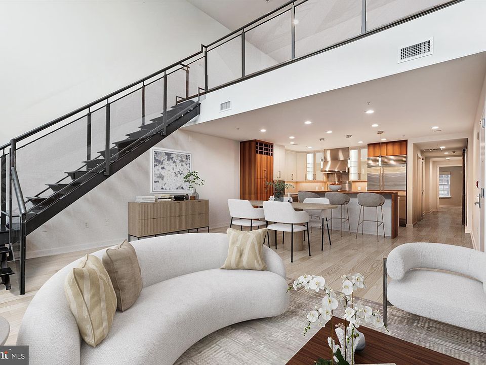 GREAT NEW PRICE for this fabulous, rarely available penthouse at Gaslight Square where only two other penthouses have hit the market in the last two years! Spanning 2,000 square feet across two floors, this luxurious residence blends the hipness of a warehouse loft with sophisticated appointments. The penthouse features two bedrooms, two-and-a-half baths, and a grand great room with a 19-foot ceiling, gas fireplace, wall of windows, and a loft. Hardwood floors extend throughout the home, which also boasts a private outdoor terrace with stunning skyline views. The open, gourmet kitchen is equipped with an oversized island, a six-burner Wolf gas stove, a Subzero refrigerator/freezer, and ample cabinet and counter space. The primary bedroom is located on the main living level, while both bedrooms include ensuite baths and professionally designed closet systems in their walk-ins. The loft and main living room offer smart storage solutions, and motorized blinds are installed throughout the home. This unit also conveys with two reserved, assigned garage parking spaces plus a private storage room (or 3rd parking space). For ultimate convenience, direct elevator access from the parking garage delivers you right into your home, making trips with luggage and groceries effortless. Gaslight Square is a boutique condominium development known for its privacy and exclusivity, ideally situated amidst the businesses, restaurants, grocery stores, gyms, and amenities of Arlington's thriving Courthouse and Rosslyn neighborhoods. Residents enjoy walking distance to two Metro stations and Georgetown, as well as a short commute to other points in the District, Tysons Corner, Alexandria, and the area's two major airports. Originally built in 2013, Gaslight Square was designed as an ultra-luxe, minimalist condo community, featuring steel and concrete construction for superior quiet and privacy. This pet-friendly community is professionally managed, with impeccably maintained and landscaped grounds. *Contact listing agents for more information or to schedule a private showing. **Lead photos are virtually staged to show interior design ideas, including refinished or lighter wood flooring.**