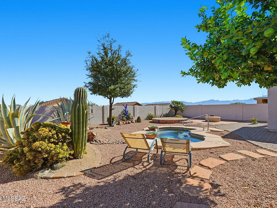 OWNED SOLAR, water softner, vaulted ceilings, knotty alder cabinets w/deep pot drawers,& a stunning backyard make this Desert Creek home a standout! This 2BR, 2BA + den layout features a remodeled kitchen w/granite counters, large island, travertine backsplash, stainless/black appliances, & a spacious pantry closet. Tile flooring throughout, except in the primary, w/the primary suite offering a walk-in closet & French doors to the patio. Enjoy outdoor living w/a built-in grill, gas fire pit, extended paver patio, elevated dining area w/mountain views, & a delicious producing lemon tree. Relax in the SPOOL--cool by day or heated for a soothing soak at night. Expanded 2-car garage with 4' bump-out for extra storage or workbench.OWNED SOLAR ensures comfort & efficiency year round!WELCOME HOME