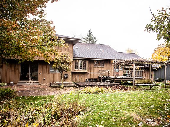 Brick and cedar-sided homeBrick wood-burning fireplaceMature oak treeGrape arborBasketball uprightEjector and sump pumpsApple trees