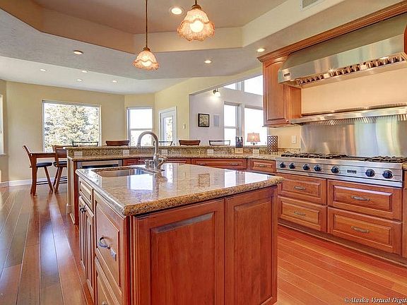 This home offers panoramic views of the inlet, city lights, Denali And Chugach range (150 view) while maintaining a park like setting on the 1+/- acre lot. It features 5 bedrooms, 3.5 bathrooms, and in-floor radiant heating! The hallmark of the kitchen is a Viking 48'' range with a built in grill. The kitchen could be well suited for multiple chefs.