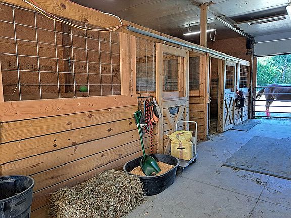 5 Acres of beautifully maintained property. Maintenance free, 3-4 Bedroom, 2 full bath, brick home w-vinyl siding, seamless gutters, central air & and updated energy efficient furnace. The house is self sufficient w-an automatic house generator. 500 gal propane tank is property owned. Woodburning fireplace w-a blower . 3 car heated garage, newer epoxy floor and plenty of storage cabinets. 30x40 insulated pole barn, attached lean, electric, water and automatic barn doors. Recently professionally painted. Horse lovers, the barn is equipped with 2 stalls and a 3rd for hay storage or a new pony. The pasture is wood fenced & divided with electric rope. Half the pasture has been reworked and seeded this year. The back wooded property has trails which is perfect for a quick trail ride, hunting, or just take a leisurely stroll in your own park setting.