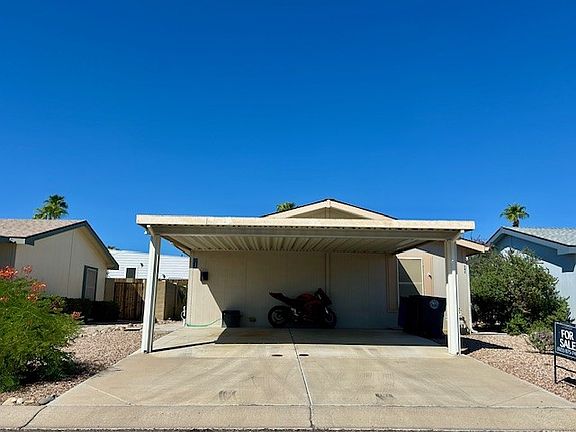 Interior pictures, coming soon! This beautiful 1040 square foot manufactured home was built in 2007 home located in the Coppersun community in El Mirage, AZ. The home features 3 bedrooms, 2 bathrooms, a spacious living room, dining room, master bedroom with en suite bathroom and walk-in closet, as well as a fully equipped kitchen and laundry room. The exterior of the home includes a carport, shed, patio, fence, trees on the property, and Cemplank/Smart Panel siding. Additionally, the home comes with all appliances including an oven, fridge, dishwasher, garbage disposal, washer, dryer, hot water heater, washer/dryer hook up, and central A/C.Coppersun is a charming community located in El Mirage, AZ that offers residents a relaxing and peaceful environment to call home. The community features amenities such as a clubhouse, pool, gym, billiards, bocce ball, pickleball court, many activities and is perfect for enjoying the sunny Arizona weather. Coppersun is conveniently located near shopping, dining, and entertainment options, making it an ideal location for those looking for both convenience and comfort. Residents of Coppersun also enjoy easy access to nearby parks, shopping, restaurants and major highways for easy travel throughout the area.