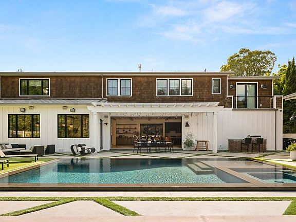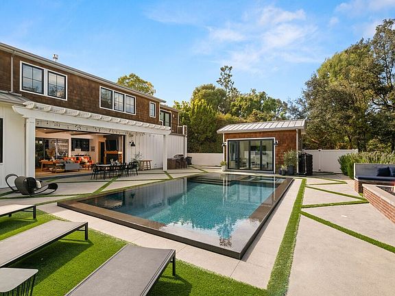 Welcome to this stunning modern-traditional home ideally situated on a quiet cul-de-sac in the highly sought-after enclave of Royal Oaks, Encino. Built in 2018, this newer construction (not a remodel) offers a limited builder warranty and is designed for the discerning buyer who values both elegance and modern conveniences. With impeccable curb appeal, the gated property immediately captures attention, inviting guests into a soaring foyer with high ceilings and European oak floors throughout. The elegant living room features a grand fireplace, seamlessly flowing into a formal dining room perfect for hosting. A glass-enclosed private office with custom built-ins provides a refined workspace with exquisite finishes. The heart of the home is the chef's gourmet kitchen, a true masterpiece. It boasts double islands with Calcutta quartz counters, a 60-inch Wolf range, a 72-inch built-in Sub-Zero fridge, a large walk-in pantry, and a butler's pantry. The spacious breakfast area is adjacent to a cozy family room, which showcases beautiful built-ins and a fireplace. Floor-to-ceiling pocket glass doors open to a sprawling entertainer's yard, creating a perfect indoor-outdoor flow. The main floor also offers a state-of-the-art home theater, a stunning powder room, a mudroom, and a wrought-iron, glass-enclosed wine cellar.Upstairs, the romantic master suite is a true retreat, featuring a sitting area and a dual-sided fireplace. The two expansive walk-in closets and a spa-like master bath complete with a soaking tub, glass rain shower, dual sinks, makeup vanity, and two water closets offer ultimate comfort and luxury. The entertainer's yard is a spectacular oasis with a zero-edge sparkling pool and spa, a fire pit, a built-in barbecue, and a pool house with its own bathroom. Thoughtfully designed for modern living, this home includes a full metal roof throughout, all underground utilities, a whole-house water filtration system, and smart home technology with integrated Control4. Additional features include a three-car garage and the option to purchase the home partially furnished. This exceptional residence offers a luxurious lifestyle just moments away from Encino's finest shops, dining, and more.