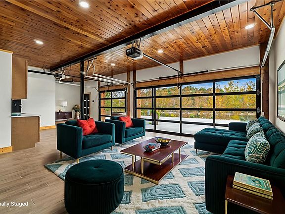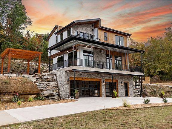 Perched above Beaver Lake, The Cliff House is a striking modern retreat that merges bold architecture with breathtaking views. Just minutes from downtown Rogers, and a public boat launch, this newly built home captures sweeping water vistas from nearly every room. An outdoor water feature brings the lake sounds right to your front door. The open-concept design features dramatic ceiling heights, clean lines, and curated finishes that showcase craftsmanship and creativity. At the heart of the home, the kitchen and living area share a dual-sided fireplace and open seamlessly to a full-length deck—perfect for entertaining or unwinding lakeside. But the showstopper lies downstairs: a hidden door disguised as a bookshelf reveals an incredible wine and cigar lounge built into the natural rock, complete with a secure vault door and custom lighting. Three bedrooms, three and a half bathrooms, a finished lower level, and a geothermal system complete this one-of-a-kind retreat—an architectural masterpiece designed to impress.
