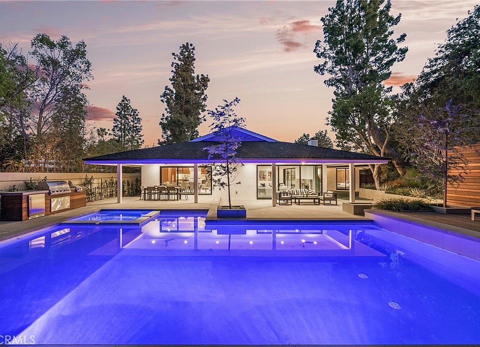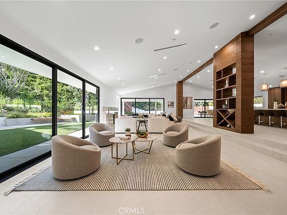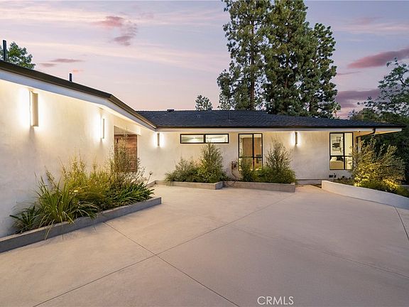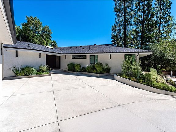 Extremely rare 4,200 SF single level completely reimagined mid-century modern located at the very end of a quiet cul-de-sac in the coveted Royal Oaks neighborhood of Encino. The property sits elevated above the street with long driveway flanked by lush landscaping including a mature olive tree that leads to a motor court and newly built 2-car garage. Step inside to find a sprawling one level open floor plan with soaring ceilings, immaculate attention to detail, and bespoke designer finishes. The grand entry foyer has a guest powder bathroom and opens to an expansive living room with vaulted ceiling, two sets of sliding glass doors that open seamlessly to the backyard for optimal indoor/outdoor flow, custom storage displays, and stone fireplace. The chef’s gourmet kitchen boasts center island, stainless Thermador appliances, custom cabinetry with appliance garage, and separate dining area with glass slider that opens to the yard. The luxurious primary suite has two large walk-in closets with custom built-ins and private bathroom with stone integrated custom vanity, walk-in shower, soaking tub, and separate toilet room. There are four additional well appointed bedroom suites, each one has a private and uniquely designed bathroom. One of the secondary suites is located on a separate wing with its own exterior access ideal for guests or office space. The entertainer’s backyard is extremely private with no neighbors in sight featuring redesigned swimming pool & spa with raised lounging deck, BBQ center, covered patio, and separate lawn space with built-in seating area. Truly private residence with stellar location and quality craftsmanship. Adjacent to top tier dining and shopping with easy freeway and canyon access. Also available for lease.