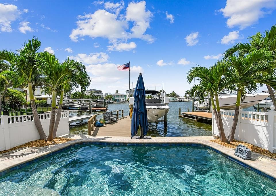 SIGNIFICANT $$ PRICE IMPROVEMENT!!! Coastal waterfront luxury home just steps from Redington Beach | Over 3,000 square feet | fully renovated (2025). This stunningly renovated, move-in-ready 3-4 -bedroom, 3-bath waterfront home blends luxury, space and functionality with thoughtful coastal vibe upgrades. Featuring an open-concept layout, designer kitchen, expansive living spaces, custom built-in shelving, and a private upstairs primary retreat with panoramic water views. Enjoy a heated saltwater pool, outdoor kitchen-ready gas setup, and composite dock with 7,000-pound lift. Major upgrades include full downstairs reno (2025) plus upstairs addition (2016). Pavers, retaining seawall, saltwater pool, gas lines (2017–2018.) New entry doors, roof (2021–2023). New Trane HVACs, floors, pool heater and pump (2024–2025). Custom closets (2022). Natural gas. Enter the spacious great room, featuring lots of natural sunlight, plantation shutters, barn doors and wood-accented ceilings. The open-concept kitchen boasts quartz countertops, stainless appliances, a large island, exposed beams and designer tile. A bright, expansive family room offers flexible living and dining space with abundant natural light and a fireplace for ambiance. The main level includes two full baths and 2-3 guest bedrooms—one with a renovated en-suite bath—plus a cozy den with a custom bar and wine refrigerator. A large bonus room can serve as a fourth bedroom, home office, gym, storage or convertible garage. A beautifully updated interior laundry room and third full bath round out the first floor. Upstairs, the luxurious primary suite features vaulted ceilings, wood beam accents and a four-panel sliding glass door overlooking the water. The spa-like en suite includes a spacious walk-in shower, jetted tub, private water closet and modern double vanity. Plenty of space in the custom walk-in closet too! The primary suite opens to a gigantic rooftop deck with panoramic views and lots of expansion potential to increase interior or exterior space. Add more bedrooms or finish out for a glorious panoramic rooftop deck. The backyard is an entertainer’s dream with a heated saltwater pool, extensive paver decking, a large motorized retractable awing provides shade to relax poolside in the heat of the day, and gas connections for grills and equipment. The composite dock includes water, power, and a 7,000-pound lift for boating enthusiasts. All this just a short distance to the powdery sands of Redington Beach, minutes to fine dining, shopping, downtown St Pete and only 40 minutes to Tampa International Airport. Whether you’re looking for a full-time residence or luxury vacation home, this turnkey property delivers coastal living at its finest.