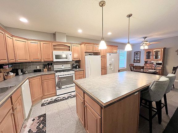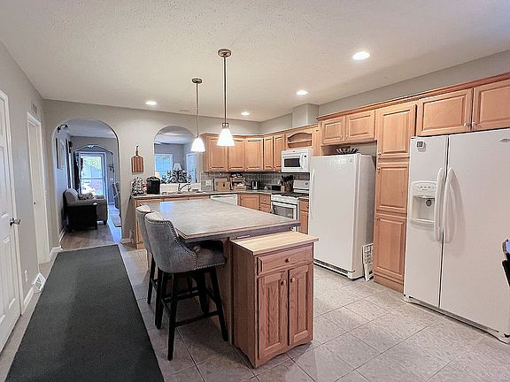 Large living room with fireplace, gorgeous country kitchen with attached dining area, primary bedroom suite with walk in closet and oversized bath. Additional 2 bedrooms and full bath off the living room. Storage room and sun porch with heat in the back of the house. Shed has lights and electric. Just a beautiful property, come see it!