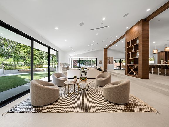 Comes fully furnished! Available unfurnished for $19,000/month. Extremely rare 4,200 SF single level completely reimagined mid-century modern located at the very end of a quiet cul-de-sac in the coveted Royal Oaks neighborhood of Encino. The property sits elevated above the street with long driveway flanked by lush landscaping including a mature olive tree that leads to a motor court and newly built 2-car garage. Step inside to find a sprawling one level open floor plan with soaring ceilings, immaculate attention to detail, and bespoke designer finishes. The grand entry foyer has a guest powder bathroom and opens to an expansive living room with vaulted ceiling, two sets of sliding glass doors that open seamlessly to the backyard for optimal indoor/outdoor flow, custom storage displays, and stone fireplace. The chef's gourmet kitchen boasts center island, stainless Thermador appliances, custom cabinetry with appliance garage, and separate dining area with glass slider that opens to the yard. The luxurious primary suite has two large walk-in closets with custom built-ins and private bathroom with stone integrated custom vanity, walk-in shower, soaking tub, and separate toilet room. There are four additional well appointed bedroom suites, each one has a private and uniquely designed bathroom. One of the secondary suites is located on a separate wing with its own exterior access ideal for guests or office space. The entertainer's backyard is extremely private with no neighbors in sight featuring redesigned swimming pool & spa with raised lounging deck, BBQ center, covered patio, and separate lawn space with built-in seating area. Truly private residence with stellar location and quality craftsmanship. Adjacent to top tier dining and shopping with easy freeway and canyon access. Also available for sale.