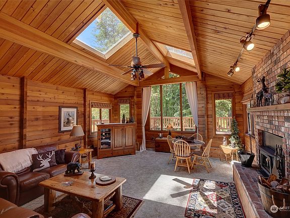 Crystal River Ranch 2552sf classic "Pan Abode" Cedar log home will steal your heart. Secluded sylvan lodge for mountain gatherings & exciting outdoor adventures. Crystal Mt & Mt Rainier within easy reach. Hike, bike, snowshoe, XC ski out the door. Impressive deck (1200sf) & large living spaces on both levels designed for entertaining. 3 bedrms plus office/den sleep crowd of 10+. Chefs & guests linger & love spacious kitchen & dining layout. Living rm snugs you in with captivating forest views, skylights, cedar walls & lofty beams. Handsome brick fireplaces broadcast warmth & anchor ambiance. Hot tub & stone fire pit stretch evenings well into the night. Carport access to big shop for recreation gear, storage & projects. Say hello to nature!