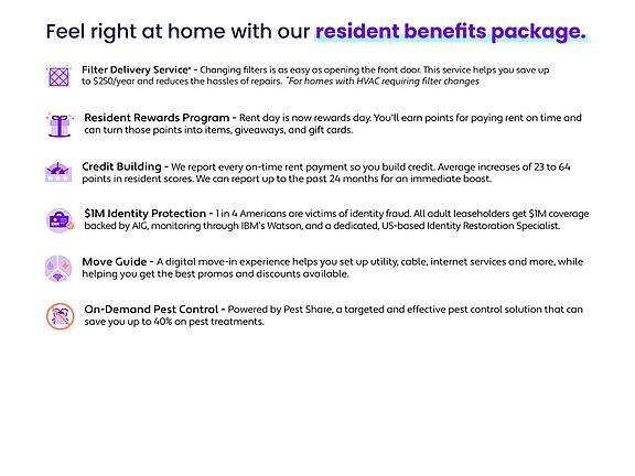 At Entwood Property Management Inc, we strive to provide an experience that is cost-effective and convenient. That's why we provide a Resident Benefits Package (RBP) to address common headaches for our residents and provide must-have services for our renters. The Monthly Price of $35.00 includes Plus pest control, HVAC air filter delivery (if applicable for property type), utility setup assistance, credit building, and rewards program. Residents have the option to personalize some components during onboarding, which may decrease the monthly amount. In addition to RBP, we provide access to a property damage liability program that meets your needs. This cost is in addition to the property's monthly rent.