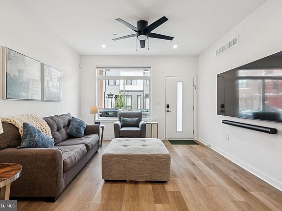 Welcome to 1611 Germantown Avenue — a beautifully maintained modern townhome built in 2021 and packed with thoughtful upgrades throughout. This 3-bedroom, 3.5-bath home includes a finished basement, a spacious rooftop deck with sweeping city views, and a full TAX ABATEMENT. The sleek brick façade offers curb appeal with a contemporary edge. Step inside to find wide-plank hardwood floors that run seamlessly throughout the home. The open main level offers plenty of room to relax or entertain, with space for both living and dining that flows into a chef’s kitchen at the rear of the home. The kitchen is outfitted with quartz countertops, stainless steel appliances, white shaker cabinetry, subway tile backsplash, and a large breakfast bar perfect for casual seating. Just off the kitchen, sits a stylish powder room. The second floor includes two bright and versatile bedrooms—ideal for guests or home offices—along with a full bathroom and a laundry room with built-in shelving. The third-floor primary suite is a true retreat. Before entering the bedroom, you’ll find a convenient wet bar with a mini fridge and cabinet space. The bedroom itself features excellent natural light as well as dual custom walk-in closets. The luxurious ensuite bathroom includes a dual wood vanity with backlit mirror, soaking tub, and a fully tiled glass shower with rainfall head and built-in niche. Walk up the steps and onto the expansive rooftop deck to take in panoramic skyline views — the perfect space for lounging or entertaining. Downstairs, the finished basement includes a full bath and can easily serve as a media room, gym, guest suite, or home office. Located in the heart of Olde Kensington, this home is just a short stroll to local cafes, shops, and restaurants. Don’t miss your chance to own this stylish, move-in-ready home in one of the city’s most vibrant neighborhoods.