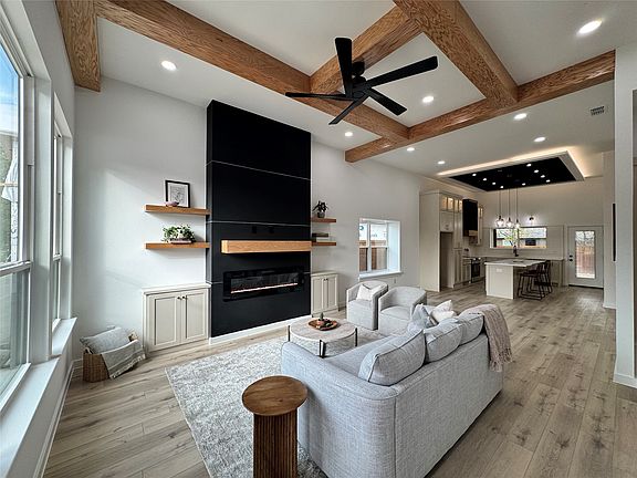 Welcome to your dream home, a stunning Custom Contemporary Modern masterpiece designed for comfort and style. Step inside and be captivated by the impressive high ceilings and the peaceful, private yard where you can unwind with breathtaking sunsets every evening in your unique custom made lit metal pergola for bonfires and family gatherings this fall season. Inside, you'll find 3 generously sized bedrooms and 2 baths all conveniently located and thoughtfully arranged with an open-concept layout. The kitchen is uniquely inspired to standout, complete with white finish Quartz countertops, a island ideal for casual dining, and stylish custom lighting finishes throughout. Luxury Vinyl Plank floors flow seamlessly through the common areas, enhancing the home's contemporary feel and carpet in the bedrooms. The living area was designed for your entertainment including an electric fireplace ready for relaxing evenings while you enjoy the sunset view from your main entry oversized windows. The home provides, ample storage by having large closets, and a conveniently located mud room built in area beside the laundry room. Additional conveniences like added accent lighting in garage, stove, microwave, dishwasher, new wood privacy fence ensure hassle-free living, making this home a statement of comfort, privacy and style. A must see, schedule a tour today.