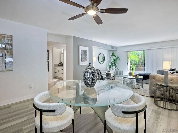 Discover the tranquility of this beautifully remodeled 2-bedroom, 2-bathroom home that offers an ideal balance of serenity and convenience, all while close to everything San Diego has to offer. Step into a world of relaxation with the gentle sounds of a private waterfall, providing a soothing backdrop to your daily life. Enjoy the lush surroundings from not one, but two private balconies, perfect for unwinding in the open space this property provides. The interior showcases a masterful remodel, ensuring modern comforts and style. With two bedrooms and two bathrooms, this space is perfect for those seeking a retreat in the heart of San Diego. This lower end-unit is conveniently located steps away from all the complex's amenities; the pool, spa, laundry room, gym, clubhouse, and tennis court. To top it off you're just a stone's throw away from local eateries, the sun-kissed beaches, and the bustling Fashion and Mission Valley malls. Whether you're looking for a peaceful escape or a convenient urban lifestyle, this property offers the best of both worlds. Don't miss your chance to own this remarkable piece of serenity in the heart of San Diego!
