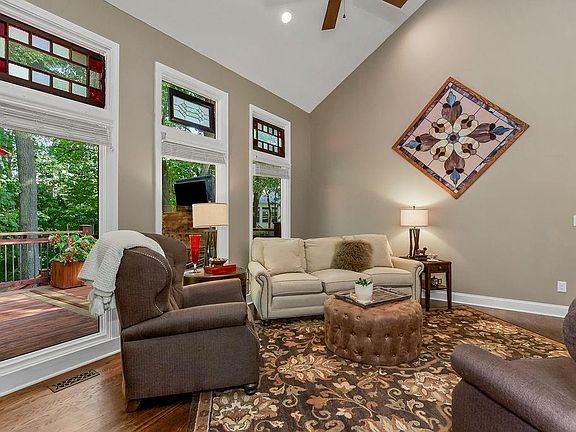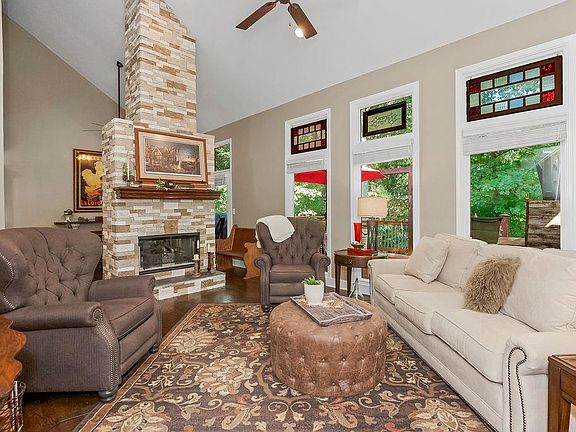 Welcome to this beautifully updated 4-bedroom, 3.5-bath, 2-story home nestled on a flat cul-de-sac with a rare combination of privacy and convenience. Situated on an oversized lot surrounded by mature 60-ft trees, a lovely stream, and thoughtfully landscaped grounds, this property offers both serenity and function. The exterior has been extensively improved with insulated vinyl siding, a high-impact resistant metal roof designed to withstand up to 120 mph winds, insulated steel garage doors, vinyl double-pane windows, and two expansive cedar decks with night lighting. Outdoor living shines with a sweeping flagstone patio and pathways, a two-story playhouse/potting shed, a large workshop/tool shed, irrigation system, hot tub, and security cameras. Inside, you’ll find a warm and inviting layout with hardwood floors throughout the main level, a striking 20-foot stone two-way gas fireplace, and a lot of fresh paint. The updated tuxedo kitchen boasts quartz countertops, stainless steel Jenn-Air gas stove with convection double ovens, Bosch dishwasher, ambient cabinet lighting, and task lighting for food prep. New French Doors in the walk-out basement open to the outdoors. The lower-level family room has built-ins, plus the potential for a 5th non-conforming bedroom with a 3rd full bath on that level. The stunning primary suite features a Tray Ceiling, a zero-step marble shower with bench, freestanding soaking tub, quartz double vanity, ambient LED lighting, and a walk-in closet with built-ins. Addt'l highlights include a 2-car garage with deep freezer/refrigerator hookups, whole-home humidifier, newer water heater (2021), and energy-efficient insulation for both comfort and savings. Conveniently located w/in minutes of Clardy Elementary, Oak Park High, Maple Woods College, a Library, grocery stores, and biking/walking trails. Only 15 minutes to MCI Airport. This home truly combines modern updates, solid construction, and natural beauty—ready for its next owners to enjoy.
