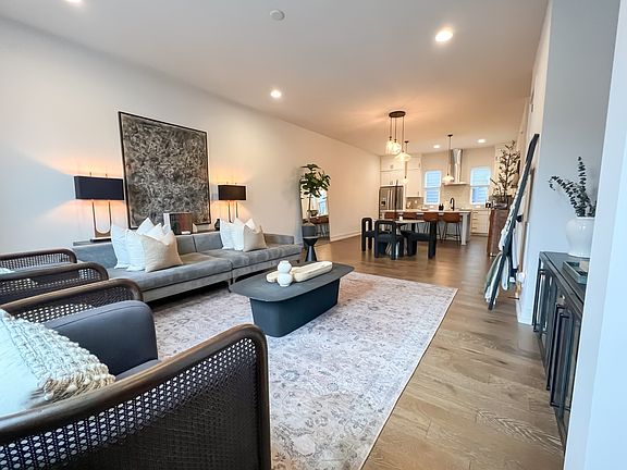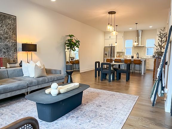 Open floor plan living space with a large kitchen that has quartz counters, stacked cabinetry to the ceiling, and stainless steel appliances. High ceilings with 10' ceilings on main level and 9' on bedroom level.