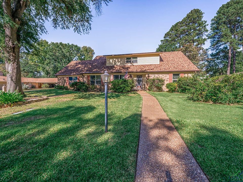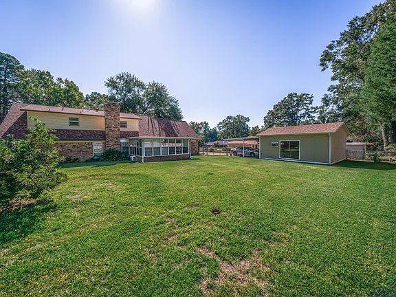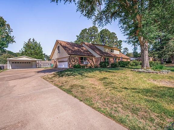 This Pine Tree ISD property is a one owner home, cared for with a meticulous focus on maintenance. 4 bedrooms, 2.5 baths, and garage capacity for 4 vehicles. Includes 2 living areas, 2 dining areas, a 320 sf heated/cooled flex space/bonus room, an office space with built ins, a second detached garage space and a storage unit. So many possibilities in this home. Split bedrooms - primary bedroom users will enjoy an en-suite, with split vanities and share a total of 3 closets! Recent updates include: some flooring, painting, windows, HVAC, new kitchen appliances. Extras include in ground sprinkler system, gutters, and reinforced walk-in attic storage space.