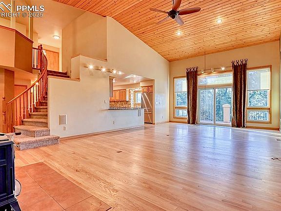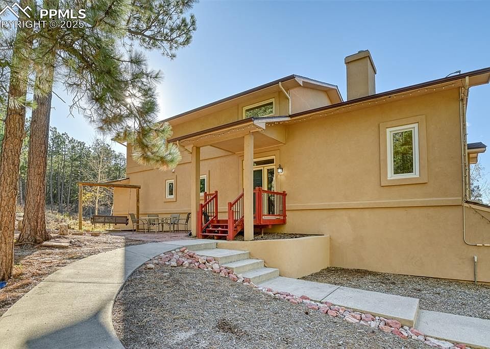 The soft scent of pine drifts through your open window as you awaken—hundreds of towering trees wrap around the property like a private forest, quiet and untouched. There’s not another house in sight. Just you, the crisp morning air, and the view—Pikes Peak, snow-dusted and majestic, framed beyond your bedroom window. As your feet touch the heated tile of the master bath, you are reminded that every detail here was designed for comfort and beauty. The one-of-a-kind walk-in shower catches the morning light, inviting you to linger. But first, the day begins the best way it can—leash in hand, your dog waiting at the door. A short walk down your private drive brings you directly into Fox Run Park—420 acres of serene Colorado wilderness, where trails wind amongst meadows and forest, and someone else does all the maintenance. It’s like having your own national park next door. Returning home, you step onto the warm tones of real hardwood flooring. The front door opens into a stunning 550 square-foot great room, crowned by a rich, tongue-and-groove wood ceiling that somehow feels both expansive and cozy. The kitchen calls—an open space anchored by striking Titanium granite countertops, where the morning light dances across the surface. Coffee never tasted better. Can you see it? This isn’t a vacation—it’s your life. A secluded Colorado retreat, yet just 2.5 miles from King Soopers, restaurants, and shops. This isn’t just a home. It’s your piece of paradise. . . . . . . . EFFICIENCY, PRIVACY, BEAUTY --- Come see it today.