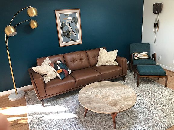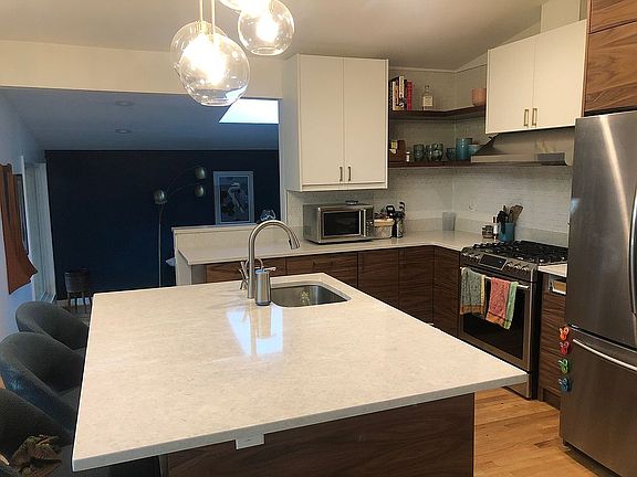 A midcentury modernist beauty with solid oak floors and vaulted ceilings! Huge picture windows and skylight give tons of natural light. Design makes the most of space, giving each area a distinctive feel but flowing smoothly into one another. Floors refinished in 2019. Fully remodeled kitchen in 2019 with large island, walnut cabinetry, stainless appliances, gas stove with vented hood, and quartz countertops. Both bathrooms fully remodeled in 2020 with walk-in shower in ensuite. Gas stove in dining/living area and 2019 tankless gas water heater. Fenced backyard provides a quiet retreat with two brick patio areas and fire pit. Quiet street is aptly named, an easy drive/bike downtown and walk to park!