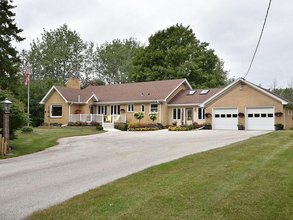 This charming 3 bed/1.5 bath ranch is situated on a 1.4-acre private lot and offers a serene and peaceful setting with mature trees and professionally landscaped grounds.Step inside to discover the vaulted family room addition, creating a bright and inviting space for relaxation and entertainment. Hardwood floors flow throughout the home, adding warmth and character to each room. The updated kitchen and bath provide modern convenience, while the numerous updates ensure a move-in ready experience.With a total size of 2150 square feet, there is plenty of room for comfortable living. This house includes a bonus detached garage, perfect for additional storage or a workshop. Located with easy access to amenities and I-43, this home offers privacy and convenience. Make this your home!