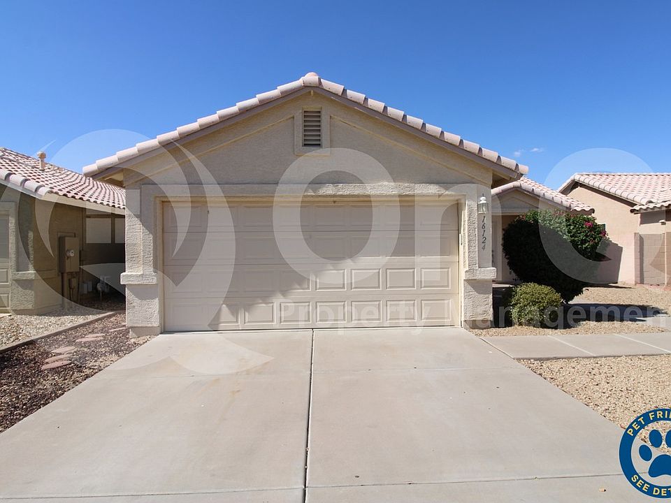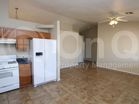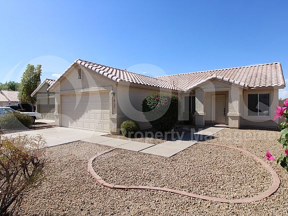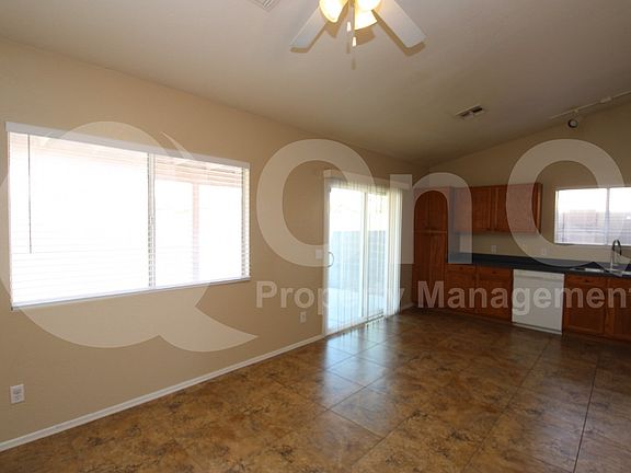 1,409 SQ FT! 4 bedroom, 2 bath home in Goodyear's Wildflower Ranch! Desirable single-story floor plan with vaulted ceilings, & welcoming great room entry. Charming kitchen with included appliances, & ample cabinetry/countertop space! Kitchen opens to spacious dining area with sliding door patio access, great for entertaining. Great room living! Neutral interior with custom tile flooring throughout. Split bedroom floor plan offers 4 nicely sized bedrooms, each with optimal privacy! Primary suite with full bath, walk-in closet, & bay window. Blinds + ceiling fans! Laundry room with included washer/dryer. Enjoy an oversized backyard with covered patio! 2 car garage + cul-de-sac lot. Wildflower Ranch is a well maintained community with playgrounds, biking/walking trails, & nearby transportation services!
