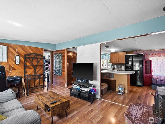 Bring your vision and tools! This 3-bedroom, 2-bath 1984 manufactured home sits on a spacious, level lot with views of Mt. Rainier and a peaceful greenbelt backdrop. Located in a quiet, commuter-friendly neighborhood, this property offers incredible potential for the right buyer. The bathrooms have seen some thoughtful updates, with a few finishing touches still needed. Several windows have been replaced, and the durable metal roof adds long-term value. A cozy wood-burning stove adds charm and warmth. The lot provides excellent space for an RV, boat, or other big toys, plus there's a small outbuilding for additional storage. Full of promise and priced below assessed value. Sold strictly AS-IS.