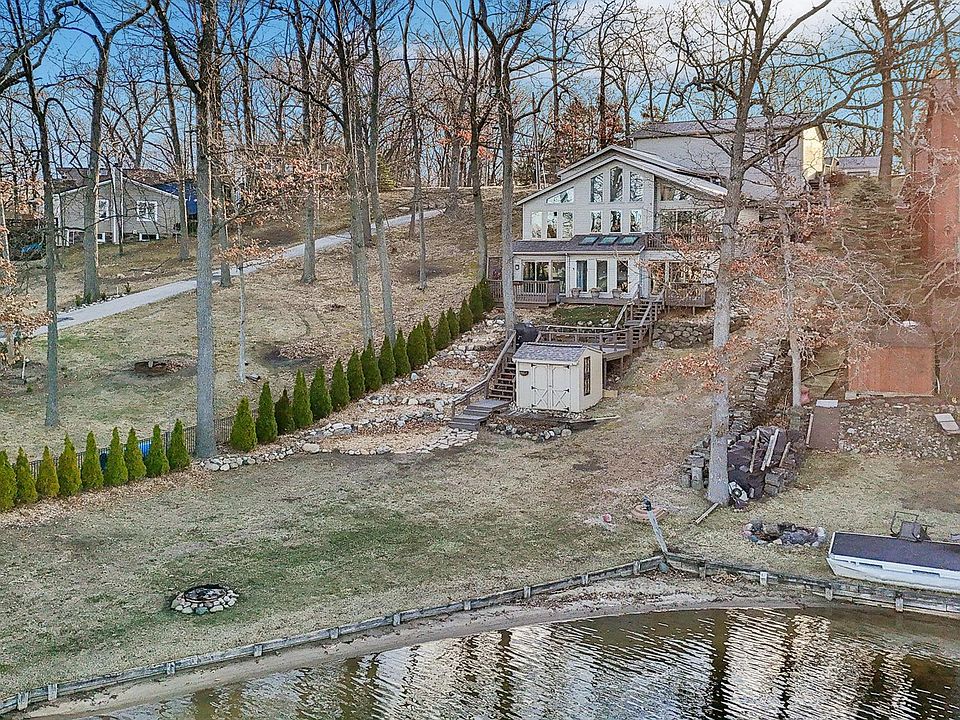 Stunning Waterfront Home with Expansive Views on All-Sports Lobdell Lake! This 3-bedroom, 2,502 sq. ft. home offers 118 feet of hard-packed sandy frontage on beautiful all-sports Lobdell Lake, with incredible views that will take your breath away. Step inside the spacious great room, where vaulted ceilings and a wall of windows frame the panoramic lake views. Cozy up next to the stone fireplace, creating a perfect ambiance for year-round living or weekend getaways. The open-concept kitchen is a chef’s dream, featuring gorgeous granite countertops, stainless steel appliances, a breakfast bar, and stunning views of the lake. Whether you're preparing a meal or enjoying your morning coffee, the beauty of the water is always in sight. The primary suite offers a peaceful retreat, with private deck access and a luxurious ensuite bath. Just around the corner, you’ll find a convenient laundry area. The versatile flex room also opens to the deck and boasts a wet bar, ideal for entertaining or relaxing with friends. Outside, the multilevel deck provides endless opportunities for outdoor living, with stairs leading down to the water's edge. The property includes an attached garage at street level and an additional garage on the included lot across the street—perfect for extra storage or a workshop. Located on a private street, this lakeside gem promises a tranquil lifestyle with all the benefits of waterfront living. Don't miss this rare opportunity to own a slice of paradise on Lobdell Lake!
