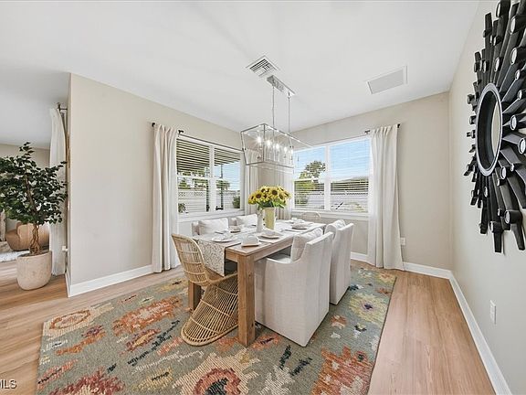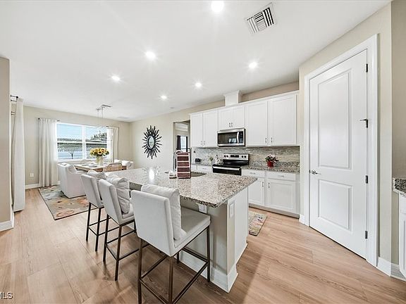 In addition to the great location, this sought after Cardinal model exudes class. As you enter, you will notice the front door high impact art glass plus all new light-wood flooring throughout, installed within this past year. The kitchen features an island, an array of 42" cabinetry, a sizable pantry, granite countertops, art glass backsplash and a refrigerator for the future, with one whole compartment that can be a wine cooler, a freezer. or more refrigeration. Off the kitchen you'll find a separate area delegated to dining. Take in the beautiful chandelier highlighting the ambiance. Next, the living room is spacious and adding to the open concept, it's so inviting for guests to congregate here anytime. A remote controlled rolldown shutter is a safe addition that adds a protective shield in a storm, and when "down", one can still see to the outdoors. The Primary Bedroom is a space where one can lounge and truly relax away from it all. With tray ceiling, and an ensuite bath, it's the cat's meow, touting dual sinks, shower, plus a Master closet with shoe shelving, closet upgrades and space galore. There are three more bedrooms, all tastefully decorated, and of course, any one would make a fine office or flex room. A beautiful screened, paved lanai expands the living space and opens to a pristine yard, beautifully maintained and fully fenced affording total privacy. A laundry room is centrally located for practicality and boasts upgraded washer and dryer. The 3-car garage is a wonder; it's fully finished, including air conditioning, heating, two large hanging storage racks, large industrial lighting, finished garage floor, painted just six months ago, and a 2nd refrigerator. What more could you ask for? This is Babcock Ranch, noted for safety during inclement weather, plus activities no matter what you prefer. There are miles of biking and hiking trails, wellness activities and gym, numerous entertainment options that include free weekly band concerts, markets, shopping and amenities for all ages. Babcock Ranch is America's first solar powered city and has earned accolades for ecologic practices and preserves.