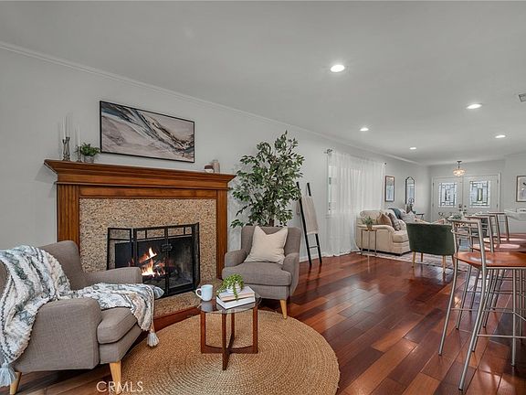 The open floorplan includes a bright living and dining area with fireplace and sliding doors to a beautiful private patio—great for BBQs and warm summer nights. The updated kitchen has newer appliances plus a sweet breakfast counter. Upstairs, enjoy three bedrooms and a sunny nook (or office space) leading to a front deck with a white pergola, balcony, and wet bar—an entertainer’s dream.