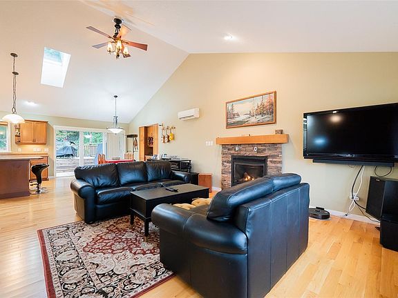 This 4-bedroom home is set back on a large lot, with the main-level living area opening directly to a custom deck and garden with raised beds and fruit trees. Enjoy direct access to walking and biking trails right from your backyard, plus RV or boat parking. The fully fenced yard includes a gate to the trails and a built-in trampoline the kids will love. Inside, Canadian Red Oak flooring runs throughout the open, bright main level with vaulted ceilings in both the living area and primary bedroom. The primary also features a walk-in closet and ensuite with heated tile floors. A split heat pump provides efficient heating and cooling, and the home is wired for a centralized sound system. Downstairs offers another bedroom and a large rec space, ideal for a theatre, music room, or potential suite with plumbing already in place. Pride of ownership shows with updates including a brand new roof installed this year, heat pump, EV plug, and rainwater collection system.