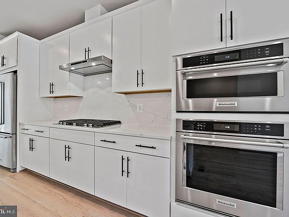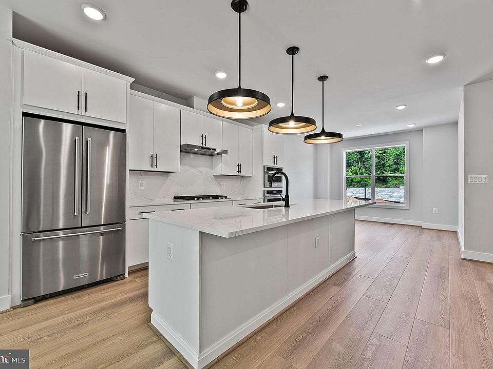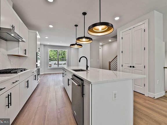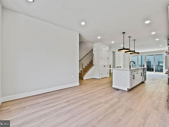The bright and airy main level offers a spacious dining room, center kitchen, and a light-filled great room with a electric fireplace and sliding glass doors that open to the outdoor living. The stylish center kitchen is complete with elegant white cabinets, Ethereal Haze quartz countertops, KitchenAid stainless steel appliances, and matte black hardware. Upstairs you’ll find a large primary suite with two walk-in closets and an upgraded primary bath with an oversized shower and Poblenou Suede quartz countertops. The second floor also has a conveniently located laundry room and a secondary bedroom that could be a second primary suite with a walk-in closet and a private full bath. The third floor has an additional half bath and a light-filled loft that opens to the rooftop terrace that is the perfect place to unwind. An additional bedroom and full bath complete the first level.