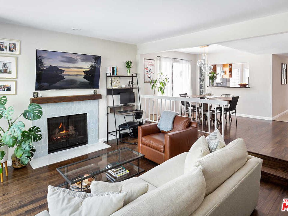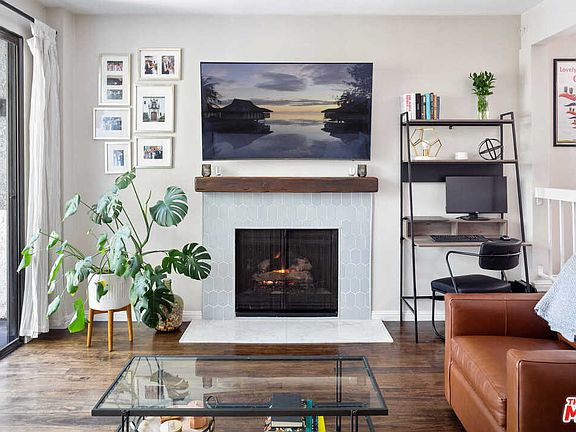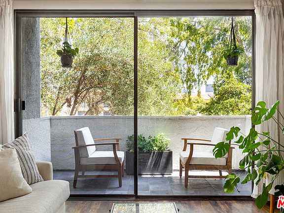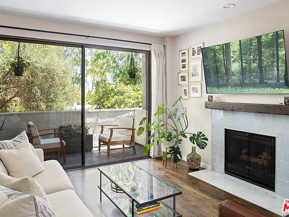 From a tree-lined street in prime Westwood, this meticulously designed townhome features two stories of airy, open-plan living space and views of Century City. Perched on a quiet residential hillside, the home welcomes with a lush and leafy entrance leading to beautifully designed interiors with rich hardwood and ceramic tile floors. Bursting with natural light from expansive windows, the main floor features a chefs kitchen with a pass-through window to the spacious dining area. The living room boasts a beautifully tiled fireplace and sliding glass doors that open to reveal a private patio and views stretching through the trees to the Century City skyline. A first-floor half bath is ideal for visiting guests. Upstairs, find two ensuite bedrooms positioned on either end of the hall for privacy. Soaring vaulted, wood-beamed ceilings create an airy expansiveness in the primary suite, which features a walk-in closet, soaking tub and leafy treetop views. Additional home features include in-residence laundry, two covered, gated parking spots and building/ground maintenance included in the low HOA dues. While quiet and private, the home is located within moments of Wilshire Blvd, UCLA, Westfield Century City, the 2 and 405 freeways.