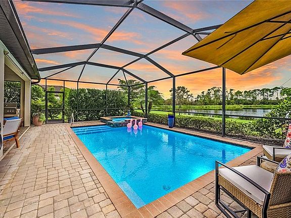 Beautiful sunset & water views from this 4 Bed 3 Full baths, 2 car garage home with pool and spa. Furnishings are negotiable! Open floorplan with lots of natural light and tile flooring throughout the main living areas and engineered oak flooring in the bedrooms. The kitchen features a large island and a walk in pantry. Crown molding in the living areas and primary bed and bath, The primary bath has a newer tub, shower and sinks and updated lighting. Paradise Grill outdoor kitchen on your large lanai with tranquil western water views. Other updates include a finished laundry room, new Maytag washer and dryer, Bosch dishwasher, updated kitchen lighting, new sink and faucet and backsplash, retractable front door screen, insulated garage door and overhead garage storage. Located a short walking distance to the clubhouse. The gated community of Artesia offers a resort style pool with clubhouse, theater, billard room, fitness center, pickleball and bocce, dog park and community kitchen and a calendar of events. Low Association fees include basic cable, wifi and lawn care. Close proximity to Naples and Marco Island beaches, shopping and dining.