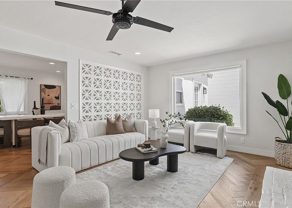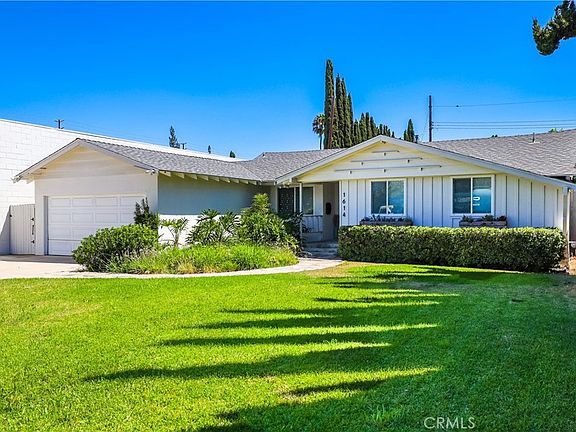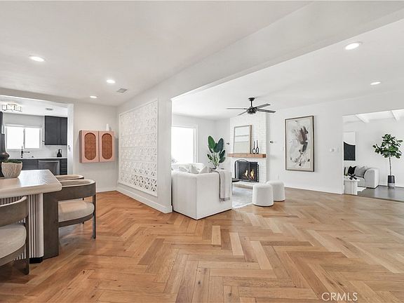 Featured on HGTV's House Hunters. Welcome to 1614 E Palm Avenue. Nestled near Old Towne Orange, this charming single-level ranch style home offers the perfect blend of modern amenities and classic appeal. As you step inside, you're greeted by the warmth of herringbone hardwood oak flooring that leads you into the spacious living room. The brick fireplace and a striking breeze block accent wall adds a touch of mid-century flair, creating a stylish focal point for gatherings and relaxation. Craftsman style casings adorn the doorways, adding architectural interest throughout the home. With 4 bedrooms and 2.5 bathrooms, there's plenty of space to spread out and unwind. The ensuite primary bedroom offers a private oasis, complete with its own bathroom. The newly remodeled shared hallway bathroom is a retreat in itself, boasting antiqued bronze fixtures, a deep soaking tub, marble countertop vanity, and designer tile accents. The kitchen is a functional delight, featuring stainless steel appliances and ample counter space for meal prep and entertaining. The tricorn black shaker cabinetry accents the light grey countertops for a sleek look. And with fully owned solar panels and electric car charging in the garage, you can enjoy energy efficiency and eco-friendly living. Step outside to discover your own private paradise, including a half basketball court in the backyard – perfect for friendly games and outdoor fun. Whether you're relaxing on the patio or shooting hoops, this backyard retreat is sure to impress. Located within walking distance to the historic Old Towne Orange Circle, you'll enjoy easy access to charming shops, restaurants, and entertainment options. Don't miss your chance to own this exquisite home in one of Orange's most desirable neighborhoods. Welcome yourself home to 1614 E Palm Avenue.