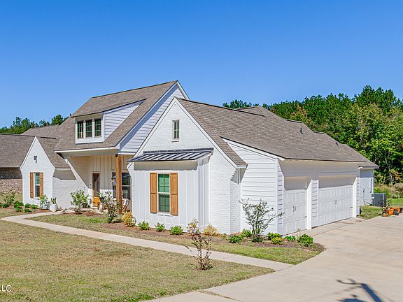 Everything you need you will find at this gorgeous home and property. This home sits on ~1.85 beautiful acres that backs up to wooded area. You are welcomed to the property by the beautiful curb appeal of the farmhouse style, a long driveway to accommodate your guests parking, a 3-car garage and sidewalk that takes you to the gorgeous southern front porch. You are welcomed in by a foyer entry, gorgeous wood flooring, open plan concept split plan. There is also a separate office, walk-in pantry and spacious laundry room. The primary bedroom is secluded from other bedrooms in this spacious split plan. The primary bedroom is very spacious with wood inlay tray celling. The primary bath is truly a place to relax and unwind and a must see to appreciate the beauty of the finishes and workmanship. All extra bedrooms are spacious with ample closet space and all your storage needs. One full bath is located between two guest bedrooms and the third full bath is adjacent to guest bedroom and assessable to your guests. The spacious covered back patio is private and overlooks the acreage and scenic views offered by back of the property. Come FALL in love with your new home! Call TODAY to schedule your private tour.
