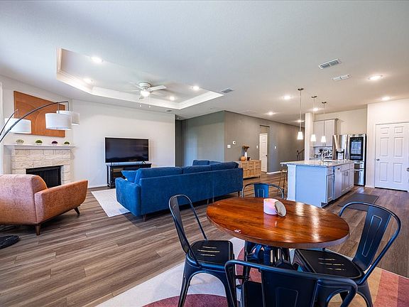Stone wood burning fireplaceStylish subway tile backsplashTall ceilingsDesigner kitchenUpgraded cabinetryOpen layout