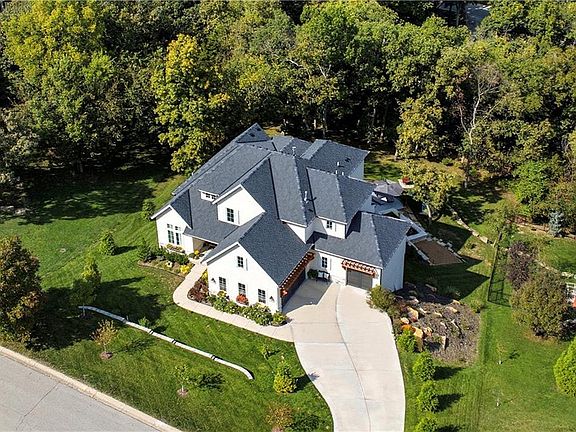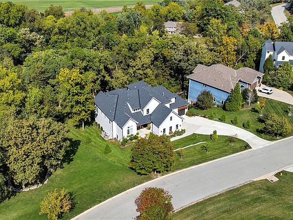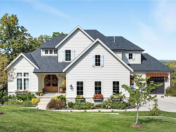 Custom-built by James Engle, this Laurel Expanded plan sits on over a half acre treed lot in River Ridge Farms West, overlooking a tiered pond. The home welcomes you with double arched wood doors and a covered front porch, opening into a main floor designed for everyday ease — featuring the primary suite, laundry, and office all on one level. Thoughtful character is carried throughout with white oak wood floors, exposed beams, and detailed trim work. Two covered porches off back. 3 spacious bedrooms upstairs all with their own private bathrooms (and a laundry shoot!). A finished walk-out lower level with exercise room/5th bedroom, a media room with surround sound, a custom built in bar & a half bath that could easily be converted to a 5th full bathroom. Enjoy the neighborhood pool and playground just steps away, plus the award-winning Blue Valley Schools District!