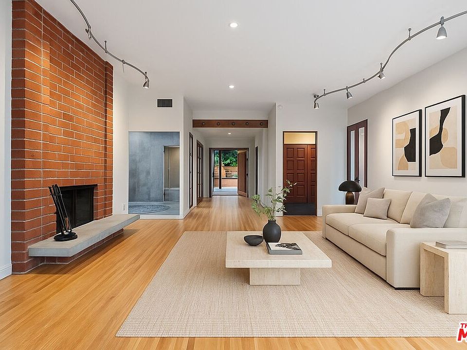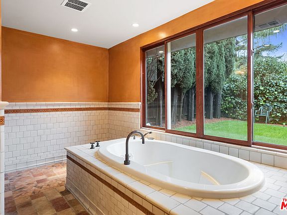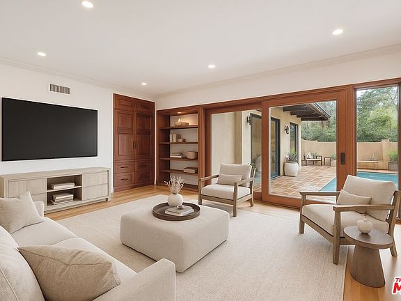 Nestled in the exclusive Royal Woods neighborhood of Sherman Oaks, this beautifully reimagined 4-bedroom, 5-bath Spanish-style home offers privacy, character, and exceptional indoor-outdoor flow. Located south of Ventura Blvd, the residence showcases warm luxury with vaulted ceilings, rich woodwork, and an open layout ideal for entertaining.The chef's kitchen features custom cabinetry, high-end appliances, a spacious pantry, and a pass-through window to the patio for effortless alfresco dining. French doors open to a lush, private backyard oasis with mature landscaping, built-in seating, fire pit, and a solar-heated triangle pool with peaceful canyon views. The primary suite is a true retreat with cedar vaulted ceilings, Brazilian cherry floors, a massive walk-in closet, steam shower, and a spa-like bath with jetted tub and bidet. There are two spacious guest bedrooms, a fourth bedroom near a separate entrance, and a light-filled bonus room that could serve as a fifth bedroom all within a flexible layout offering ample space for both relaxation and entertaining. An attached garage, generous storage, and charming architectural details throughout complete this special offering. A rare and soulful home built for both comfort and inspiration.