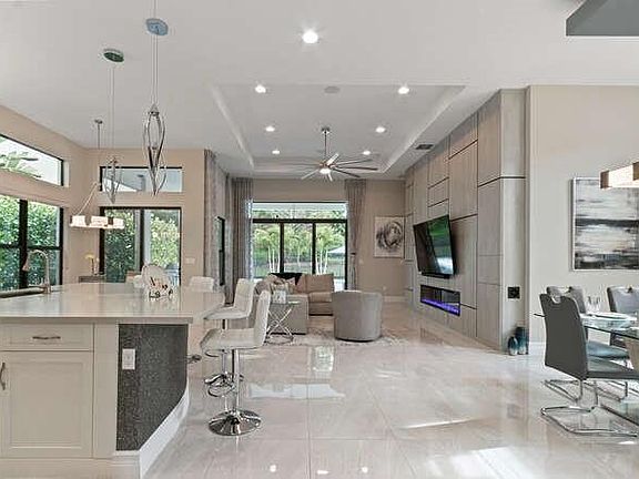 Enjoy resort living in this contemporary one story home with spectacular backyard in Seven Bridges! This summit floor plan has an open, split bedroom layout that features 3 Bedroom plus a Den which could be a 4th Bedroom. The fabulous entertaining backyard features an oversized summer kitchen with counter seating, electric screens for outside kitchen and lanai area, a salt-water heated pool with hot tub, marble patio, a turfed yard and privacy hedges. Additional highlights include it: custom feature wall with fireplace, chef's kitchen with Sub-Zero refrigerator, gorgeous modern light fixtures, custom window treatments, and a full house generator. Seven Bridges amenities: full service restaurant, 3 pools, 13 tennis courts, basketball courts, fitness center, sauna, and more!