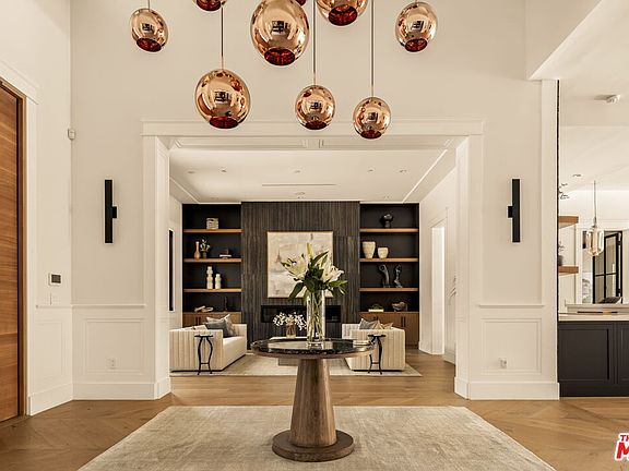 Privately gated and set at the end of a tree-lined cul-de-sac in Encino's coveted Royal Oaks enclave, this California Contemporary estate offers over 10,000 square feet of next-level luxury and exceptional privacy. A grand pivot door opens to a soaring foyer crowned by 25-foot ceilings, chevron white oak floors, and a spectacular radiant rose-gold chandelier, a dramatic introduction to the home's refined elegance and effortless style. The thoughtful layout is designed for both intimate gatherings and grand entertaining, with a glass-enclosed wine cellar beside the formal dining room, a living room that dissolves into the outdoors through retractable glass walls, and an effortless flow to resort-style grounds with a shimmering pool, sport court, and shaded lounge. The chef's kitchen is a stunning culinary atelier where dual quartz islands anchor the space, gleaming porcelain floors reflect natural light, and a coffered ceiling adds architectural drama. Upstairs, the primary suite is a private retreat with stone-framed fireplace, secluded balcony, boutique-style dressing room, and spa-inspired bath. Above it all, a rooftop lounge frames unforgettable sunset skies. For pure escape, the bespoke home theater delivers cinematic magic, while a separate 1,700-SF two-story guest house with two bedrooms, a gourmet kitchen, and sunlit living spaces extends the estate's seamless expression of elevated modern living, and design.