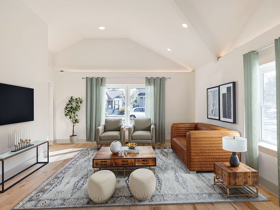 The primary suite mirrors that same sense of openness and style, with vaulted ceilings that enhance its spacious, relaxing retreat feel. Throughout the home, every selection was intentional, from the distinctive light fixtures to the brass air vent covers, each detail adding character and personality.