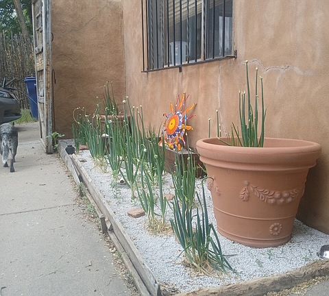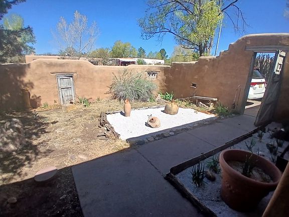 Very private single story house with 3 bedrooms, 2 full baths, galley kitchen, living room, dining room, laundry room, studio space and office in an adobe walled and coyote fenced entirely enclosed, casual, natural setting. 2 level garden; front and back and upper garden, apple trees, pine tree, Iris, Egyptian onions, ivy, native grasses, covered back porch, on a quiet cul-de-sac in a green belt very near the downtown. The house is in an Excellent location; two miles from the Plaza, in a quiet older neighborhood, very convenient to La Montanita Co-op, Baca St., Trader Joe's, restaurants, museums and galleries on the Plaza, parks, Bicentennial Pool, Meow Wolf. Within walking distance to Mandela International Magnet (MIMS) High School. Good access to major routes; West Alameda, Agua Fria and St. Francis Drive. 1675 sq. ft., mostly tile floors, Majolica tile in bathrooms, clearstories, kiva fireplace, washer, dryer, new dishwasher, electric stove, refrigerator/freezer, skylights. The house does not have air conditioning. Forced air heat mainly and in wall heater in the studio. Entrance to studio through house or outside entrance. Off street parking. Great house for creative persons and children with good flow and a nice layout.