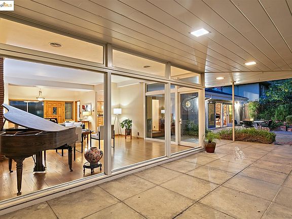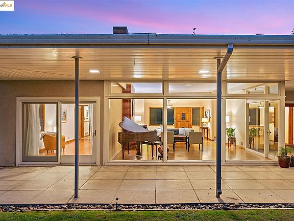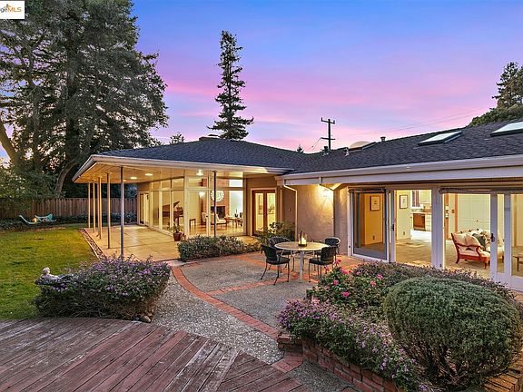 This stunning mid-century retreat is an entertainer’s dream! Nestled in a peaceful corner of LeBrun Estates near the entrance to Lake Chabot Regional Park, the home combines timeless design with modern updates and exceptional indoor-outdoor living. An inviting front patio opens to an expansive living room with grand fireplace, random plank hardwood floors, and a dramatic wall of windows overlooking the lush backyard. The updated kitchen offers stone counters, stainless steel, skylights, recessed lighting, double oven and a five-burner built-in cooktop, opening to a comfortable eat-in area and a formal dining room with built-in cabinetry. Perfect for entertaining, the home includes a large family room with vaulted wood ceilings, skylights, a full bar, and a second fireplace. Sliding glass doors from the family room and third bedroom lead to a private, professionally landscaped backyard - complete with spacious patio, grassy area, mature lemon tree, and covered outdoor fireplace. A generous primary suite provides three closets, a large vanity, and a walk-in shower. The attached two-car garage offers laundry facilities, a workshop area, and ample built-in storage. Instant access to 580, Lake Chabot and downtown San Leandro. Bath count and square footage differ. Buyer to investigate.
