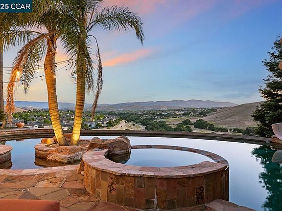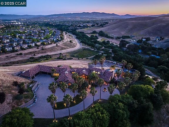 Situated in Danville atop a private hill on apx.11.6 sprawling acres, this exceptional custom estate offers a rare blend of refined luxury, architectural distinction & natural beauty. This is not just a home-it's a rare opportunity to own a slice of Danville-for those who seek extraordinary! With apx. 5,843 sq ft, this residence is exquisitely designed w/vaulted ceilings w/wood-wrapped steel beams, expansive walls of glass flooding interiors w/natural light & frame sweeping views of the valley. From nearly every vantage point, enjoy awe-inspiring panoramas-rolling hills by day & sparkling lights by nite. The elevated position ensures both privacy & commanding presence, making it a true sanctuary above it all-create a family compound! The grounds encompass 30 palm trees, infinity pool & spa, BBQ w/built-in table. Multiple courtyards adorned w/3 tranquil fountains, along w/expansive paver entryways, create a seamless connection between indoor/outdoor living. From the moment you arrive, the gated property captivates w/its grand motorcourt & 6 car garage. Inside, the home is a showcase of craftsmanship w/a grand great room, gourmet kitchen, bar & aquarium. Owner's suite w/walls of glass, fireplace, heated floors, sauna, skylight. Tesla Walls, Solar & Public Utilities! Great location!