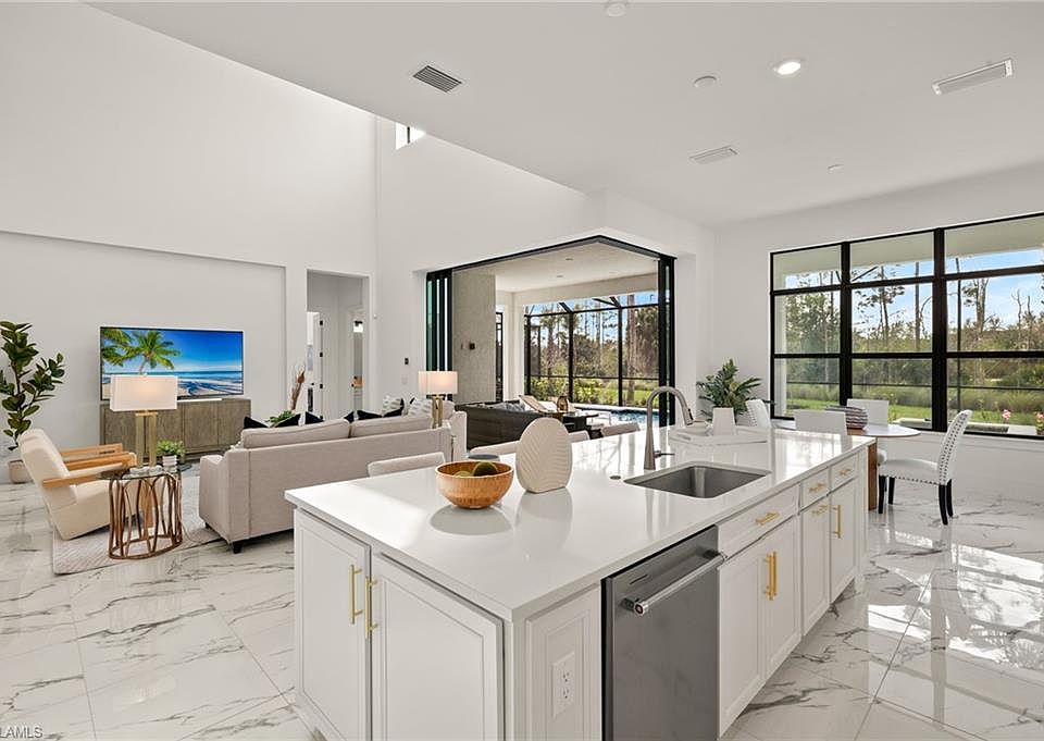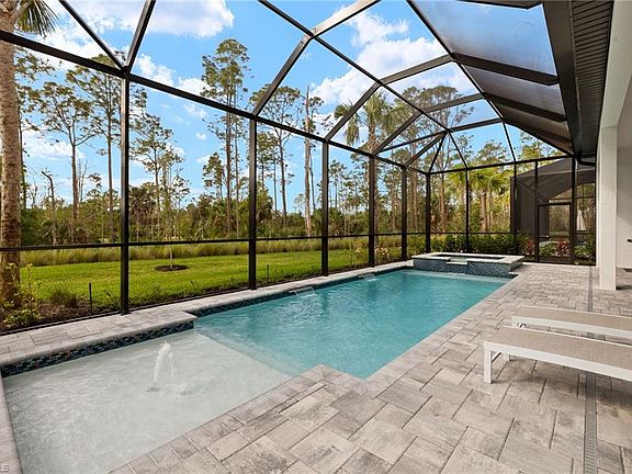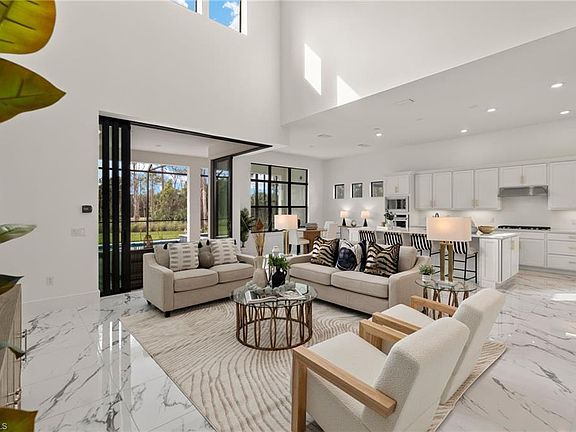 This two-story residence showcases the highly sought-after Sanibel floor plan, offering approximately 5,098 sq. ft. of living space, including five spacious bedrooms, a private office/den, six full bathrooms (including a pool bath) and one half bath, an expansive loft complete with a bar, and a media room. Thoughtfully designed with high-end upgrades and modern finishes. Upon entering you are greeted by the open-concept floor plan, where wood stair treads with iron balusters lead to vaulted ceilings and designer finishes throughout. The living room features a zero-corner sliding glass door, blending indoor and outdoor living while offering preserve views. The kitchen features custom-built Lillian White cabinetry with brushed gold pulls, an oversized quartz island in Et. Statuario, and a premium KitchenAid built-in appliance package, including a natural gas cooktop, wall oven, and beverage cooler. Additional features such as a dining room buffet, entertainment cabinetry, under-cabinet lighting, and a walk-in pantry with roll-out trays elevate the space to the highest level of functionality and style. The first-floor owner’s suite is a private sanctuary featuring a sitting area, walk-in closet, and a spa-like ensuite bath with quartz countertops, a freestanding tub, an oversized frameless shower adorned with designer Carenza Polished Oro tile. Additionally, an easy-access entry to the laundry room from your primary suite features double-stacked washer/dryers, finished off with cabinetry. The second floor is complete with a media room, an expansive loft featuring a built-in wet bar, and an additional three bedrooms with en-suite baths. The wet bar complete quartz countertops and stylish cabinetry, provides a sophisticated touch to the entertainment space. This Smart Home is equipped with impact-resistant windows throughout, a tankless water heater, upgraded HVAC with an air purification system, and a whole-house carbon filtration and chlorine removal system—ensuring comfort and efficiency year-round. The outdoor living experience is exceptional, with an extended covered lanai, a custom-designed saltwater pool and spa with a waterfall feature, and pre-plumbing for an outdoor kitchen. The three-car garage features an epoxy floor finish, providing ample space for vehicles and equipment. Ardena is a private, low-density gated community of just 77 estate homes with low HOA fees, no CDD, and access to A-rated schools including the new Aubrey Rogers High School. Located just minutes from I-75, Mercato, Waterside Shops, and Naples' pristine beaches, residents enjoy easy access to fine dining, and world-class shopping. Outdoor enthusiasts will love the proximity to championship golf courses, nature preserves, and waterfront activities at Delnor-Wiggins Pass and Barefoot Beach. With spacious lots, a private setting, and a prime location, Ardena is a blend of luxury, convenience, and an active Florida lifestyle.