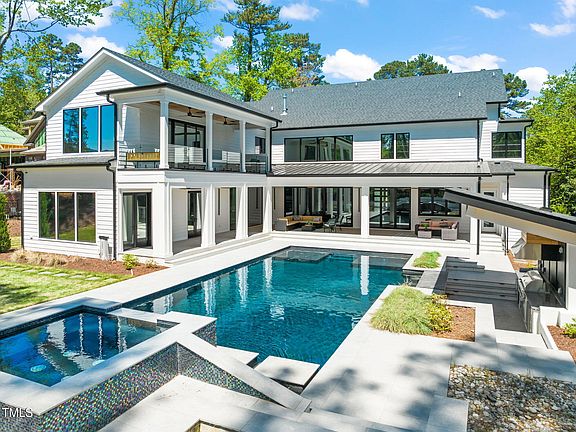 Step into elevated luxury in this custom-built masterpiece, perfectly positioned on the fairway of North Ridge's prestigious Oaks Course. Designed with both everyday comfort and high-end entertaining in mind, this home offers resort-style living in one of Raleigh's most sought-after communities. The outdoor retreat stuns with a heated saltwater pool, spa, and swim-up bar, plus a fully equipped kitchen with grill, refrigerator, ice maker, and kegerator. Enjoy evenings by the fire pit or unwind on the covered patio with heaters, fans, Phantom screens, and sleek landscape lighting. Accordion glass doors create a seamless transition between indoor and outdoor living. Inside, the gourmet kitchen is both functional and fabulous—featuring Thermador appliances, a waterfall island, pass-through window, and a hidden scullery with Nitro Cold Brew on tap. The first-floor owner's suite is a serene escape with a spa-like bath: soaking tub, open shower, and a designer closet with an island, lounge space, and custom lighting. A private office and guest suite round out the main level. Upstairs, enjoy four additional bedrooms, a fitness room, flexible lounge, and a game room with a full bar and dual kegerators, leading to a balcony with sweeping golf course views. The third floor hosts a state-of-the-art home theater with tiered seating, dual bars, and illuminated counters. A glass wine display, Control4 smart home automation, designer lighting, and wide-plank hardwoods elevate every corner. This home delivers luxury without limits—made for memorable moments, effortless entertaining, and everyday living at its finest.